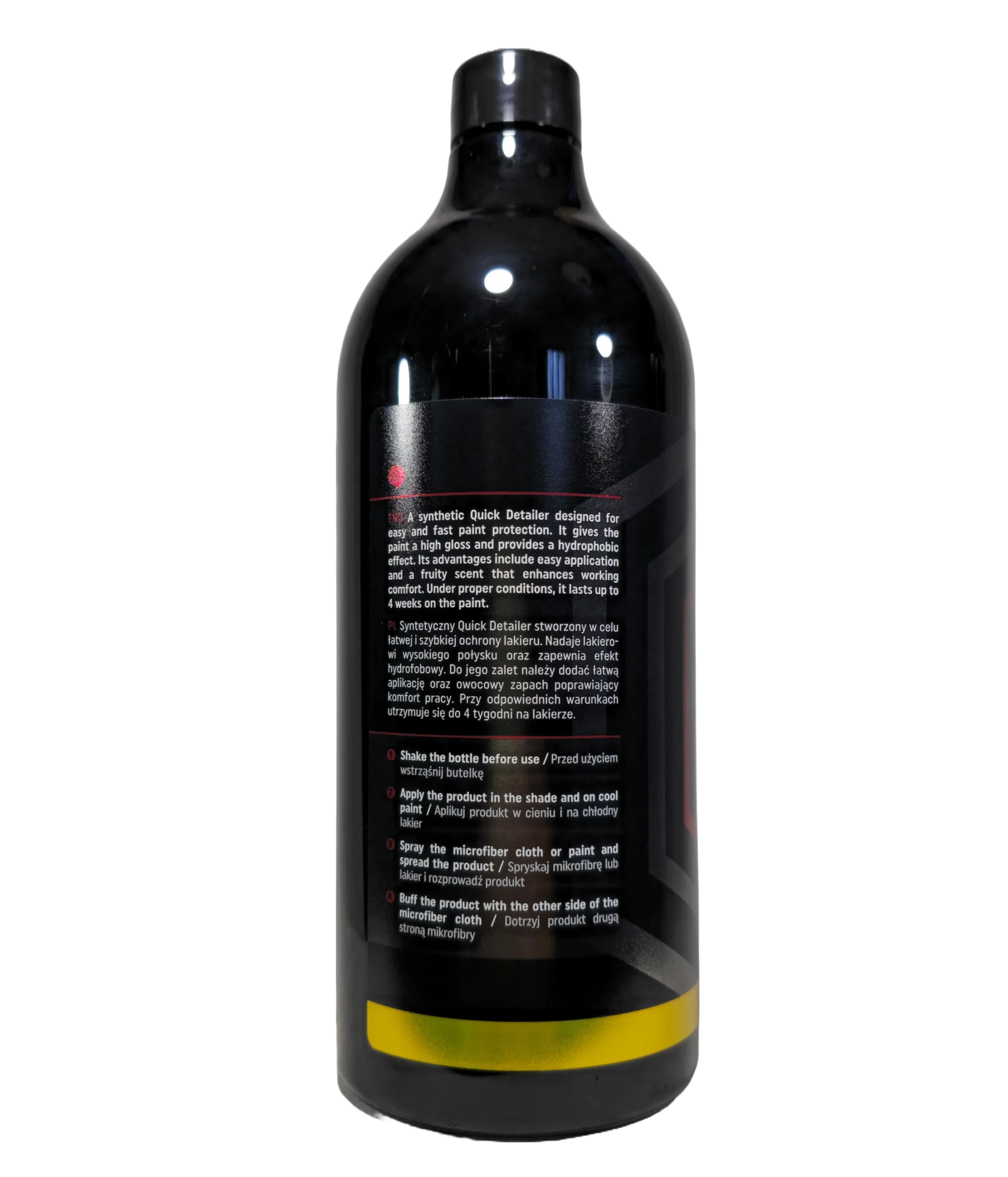 Gotowa do użycia formuła jest bezpieczna dla wszystkich lakierów, w tym zabezpieczonych woskiem lub powłoką ceramiczną. Wystarczy spryskać powierzchnię i przetrzeć czystą mikrofibrą, aby w kilka chwil uzyskać efekt „show car shine”. Przyjemny zapach i łatwa aplikacja sprawiają, że to szybki sposób na świetny wygląd auta z trwałością efektu do ok. 3–4 tygodni.