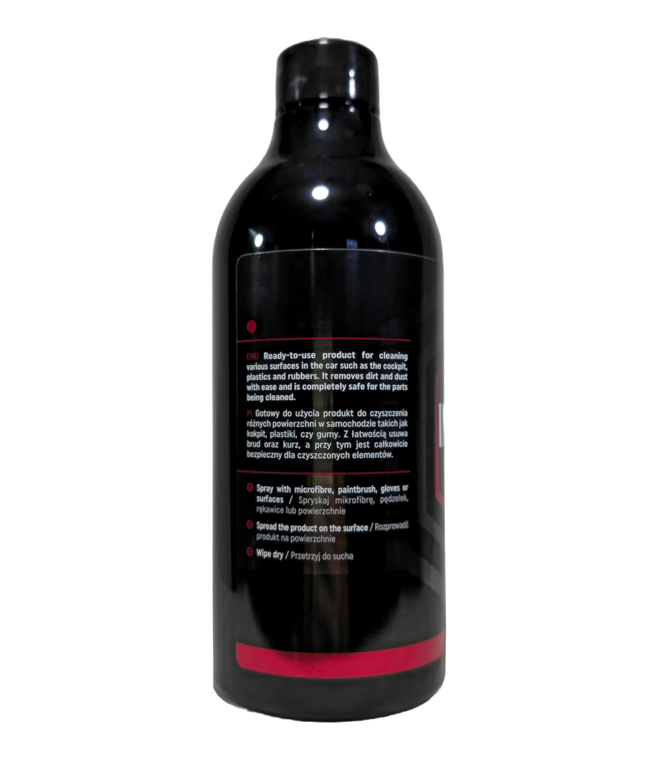 Dzięki bezpiecznej formule o neutralnym pH, produkt może być stosowany na desce rozdzielczej, boczkach drzwi, konsoli środkowej, kierownicy czy elementach tapicerki. Nie pozostawia smug ani lepkiego filmu, a jego przyjemny zapach sprawia, że praca z nim jest komfortowa. Poręczna butelka 500 ml idealnie nadaje się do użytku domowego lub do wożenia w aucie.
