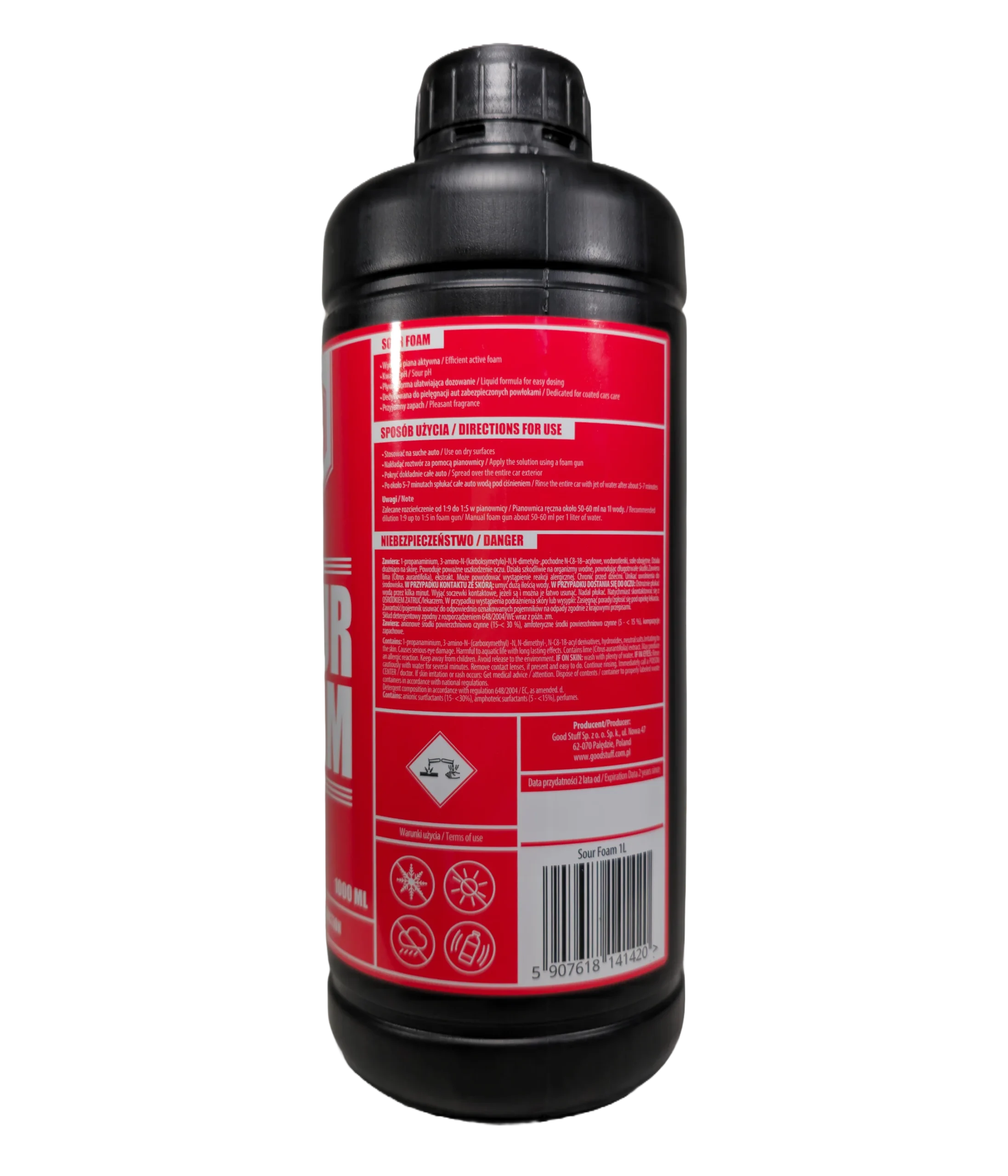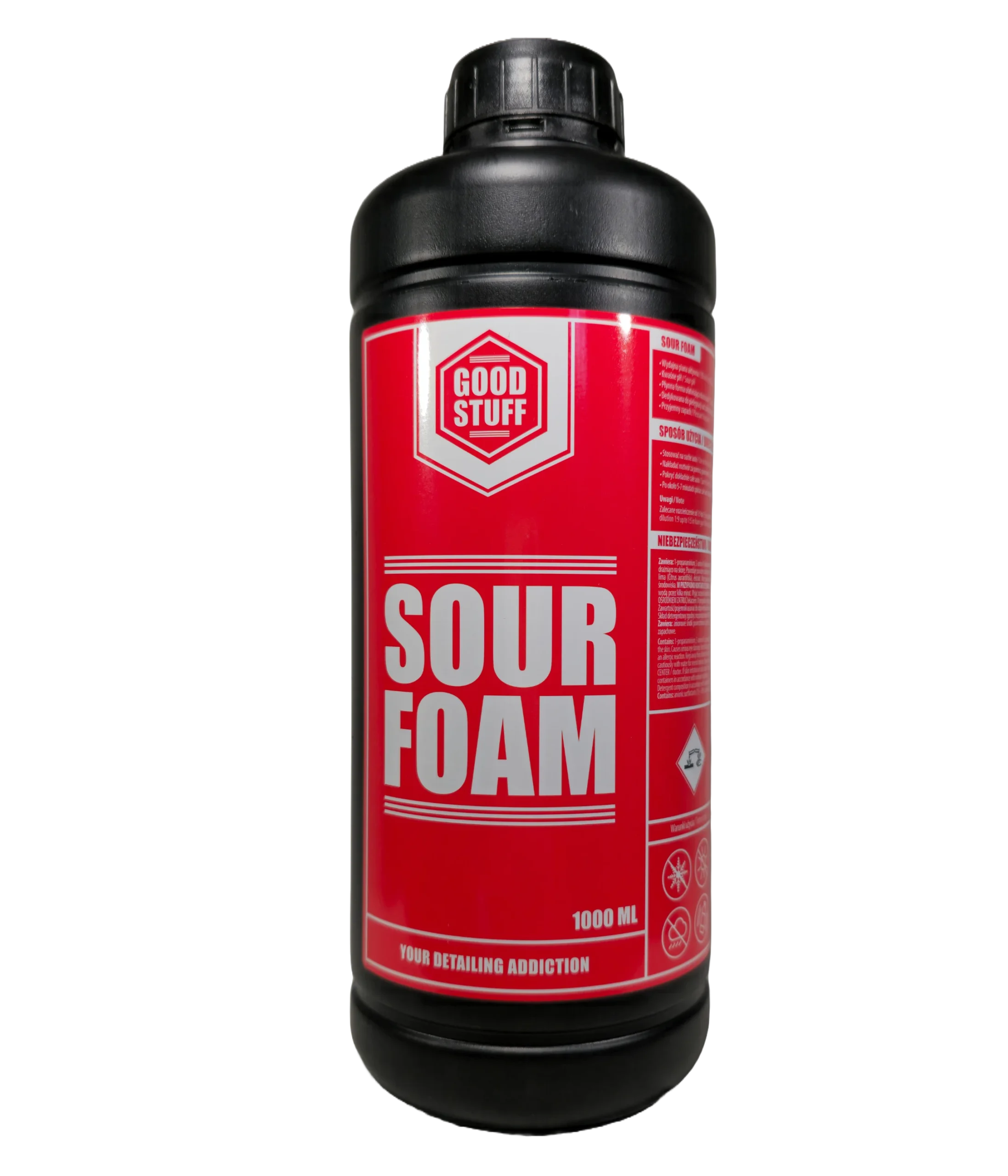 Good Stuff Sour Foam 1000 ml to kwaśna aktywna piana pre-wash, zaprojektowana do usuwania trudniejszych osadów mineralnych, śladów po twardej wodzie, wapnia czy zanieczyszczeń atmosferycznych. Jej kwaśne pH zapewnia wyższą skuteczność tam, gdzie neutralne piany zawodzą. Idealna do gruntownego oczyszczania lakieru przed detalowaniem czy aplikacją wosków i powłok. Wzbogacona o przyjemny aromat Coca-Coli, dostępna do stosowania z pianownicą PA, opryskiwaczem manualnym lub jako spray pre-wash.