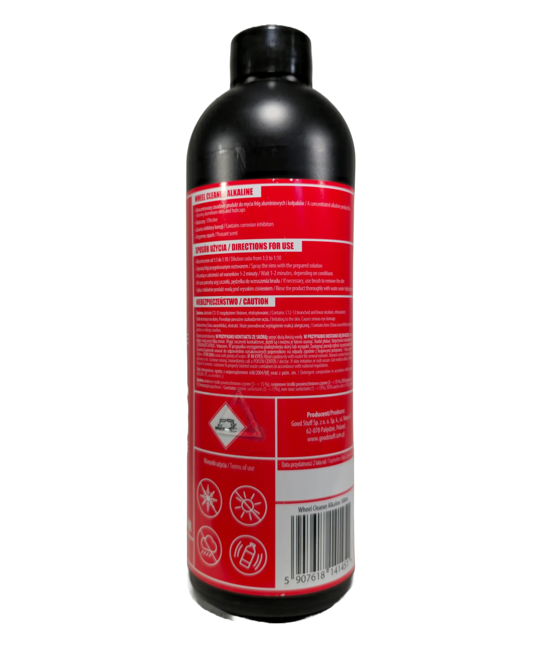 Good Stuff Wheel Cleaner Alkaline 500 ml to zasadowy preparat do czyszczenia felg, stworzony z myślą o skutecznym usuwaniu tłustych zabrudzeń, filmu drogowego oraz pyłu z klocków hamulcowych. Dzięki braku agresywnych kwasów jest bezpieczny dla felg aluminiowych i lakierowanych, a jednocześnie oferuje wysoką skuteczność działania.