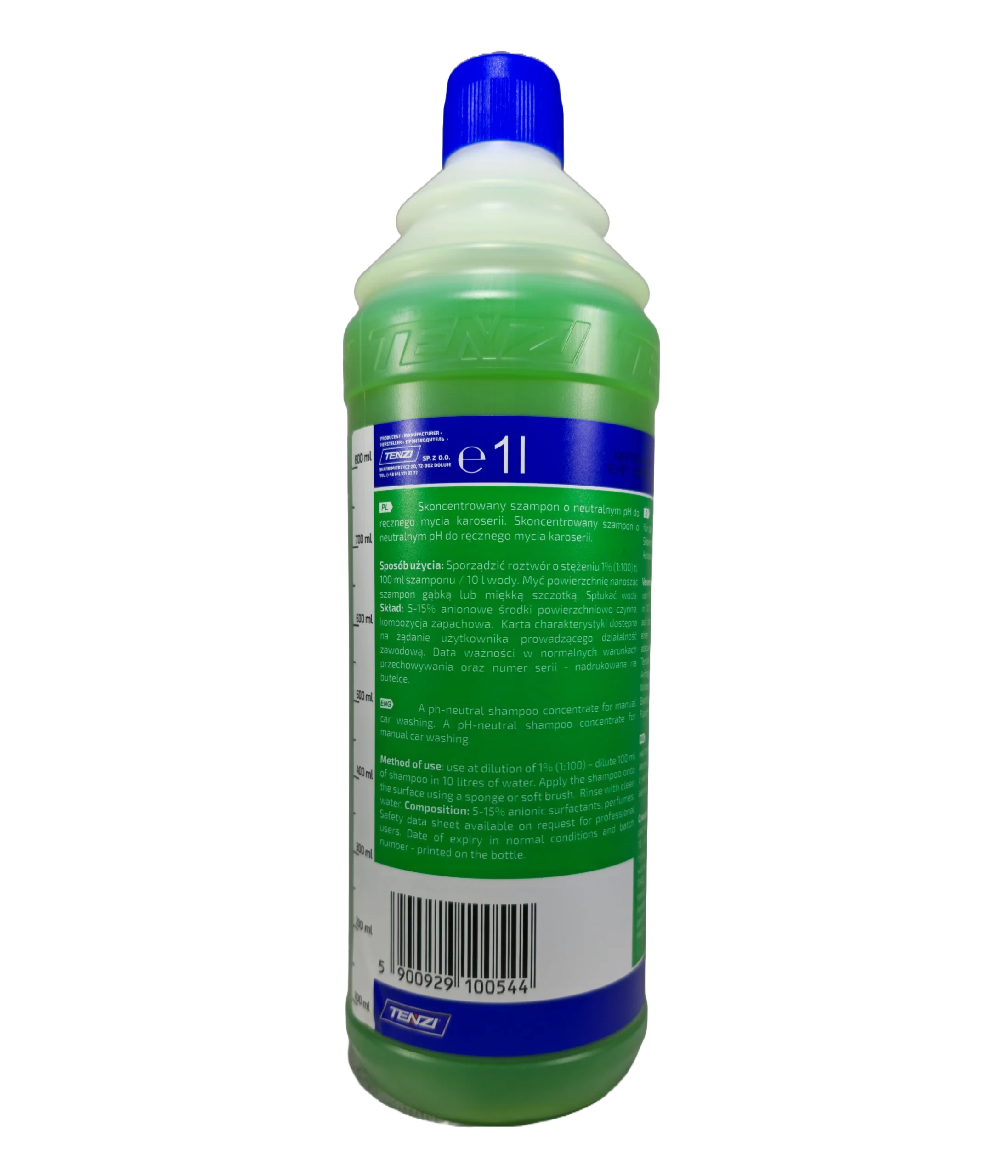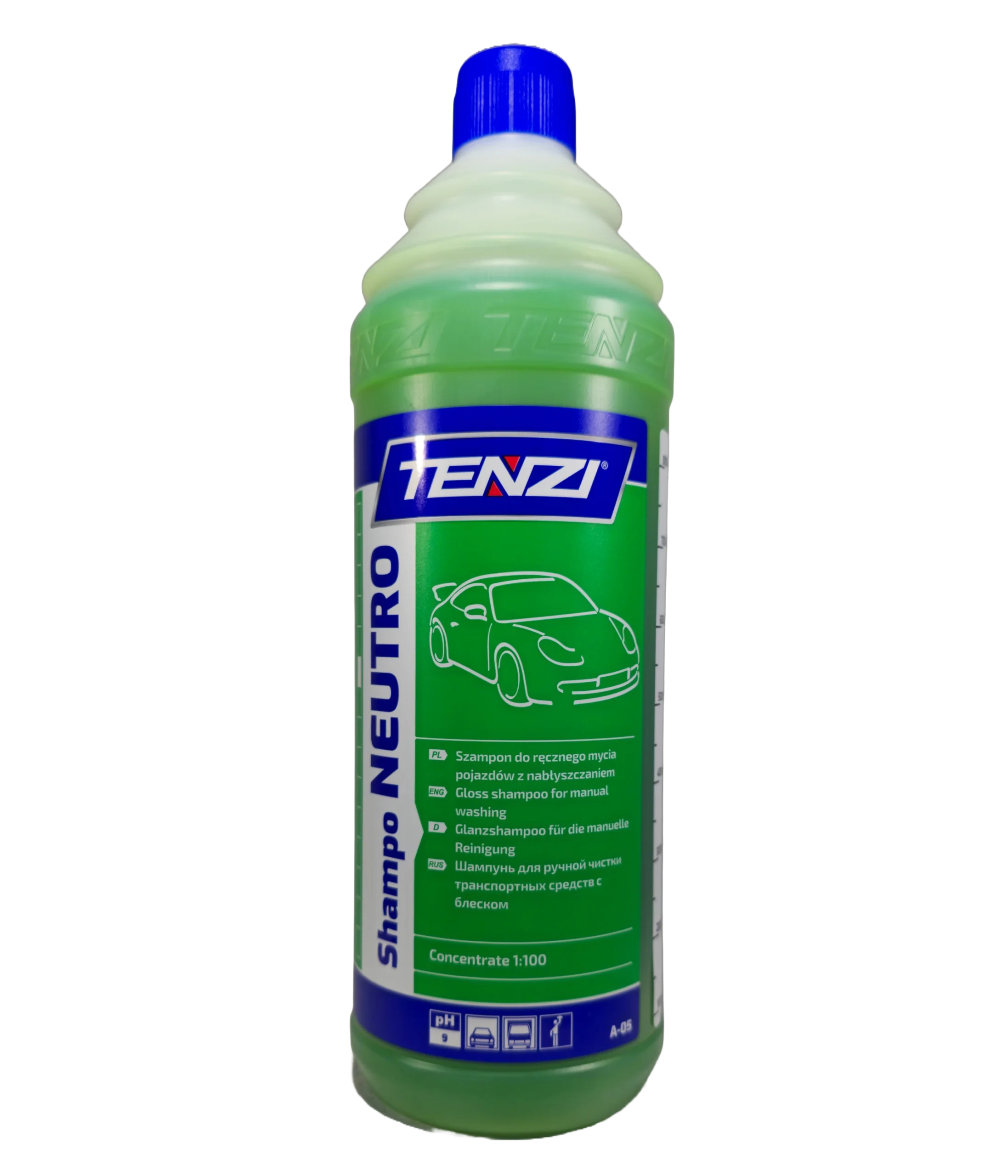 Tenzi Shampo Neutro 1000 ml to profesjonalny, skoncentrowany szampon do ręcznego mycia karoserii. Dzięki neutralnemu pH i formule bez fosforanów jest bezpieczny dla lakieru oraz istniejących zabezpieczeń, takich jak woski czy sealanty. Tworzy bardzo gęstą pianę, skutecznie czyści i wykończa powierzchnię, nadając jej połysk bez smug oraz przyspieszając mycie kolejnych zabrudzeń.